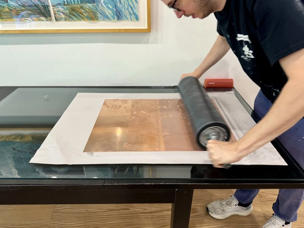 Bryan Smith rolling ink onto the etched copper plate