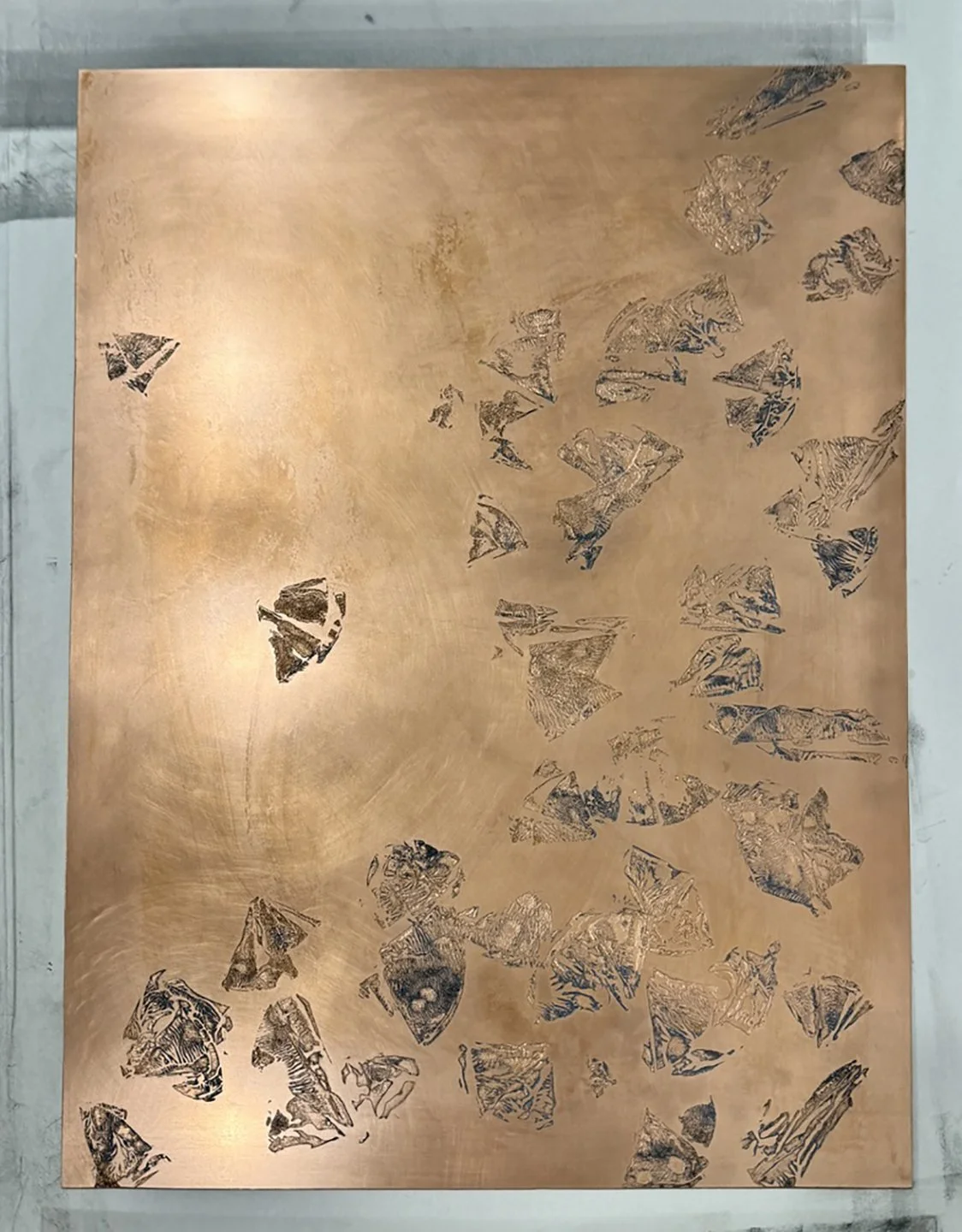 Bryan nudged me into unfamiliar territory, encouraging me to loosen my grip on control and to ‘draw’ through my own mark making. We etched the shapes into the copper plate by ‘swooshing’ my folded paper forms onto wet ground. After the ground dried, the plate was bathed in acid and we were ready. The first ink test print felt wrong. Heavy. It didn’t reflect the experience of watching the journals burn, of seeing the anger lift and float away.
